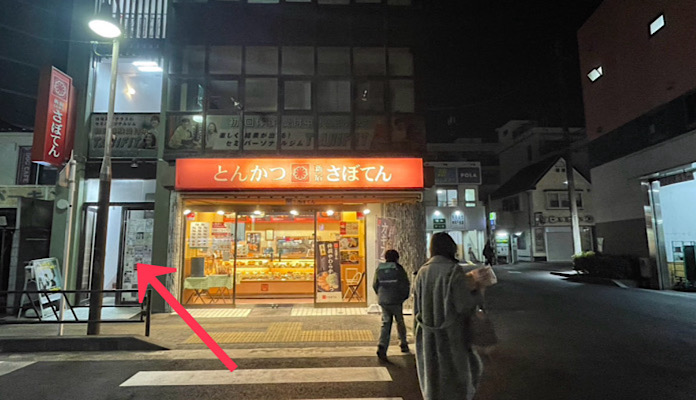 右にまっすぐ進むと、とんかつ屋さん『さぼてん』の看板が見えます。